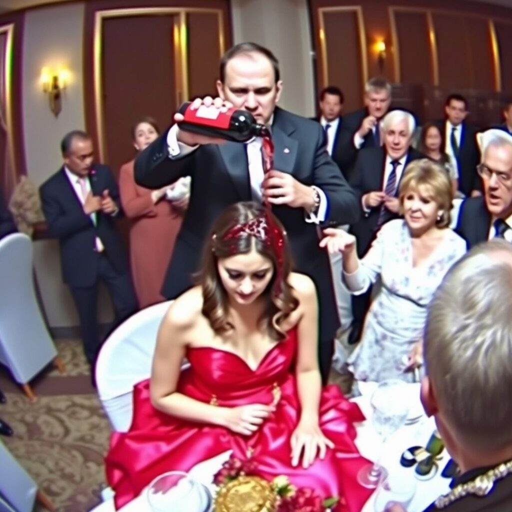 The room fell silent. Wine dripped from her hair onto her dress.