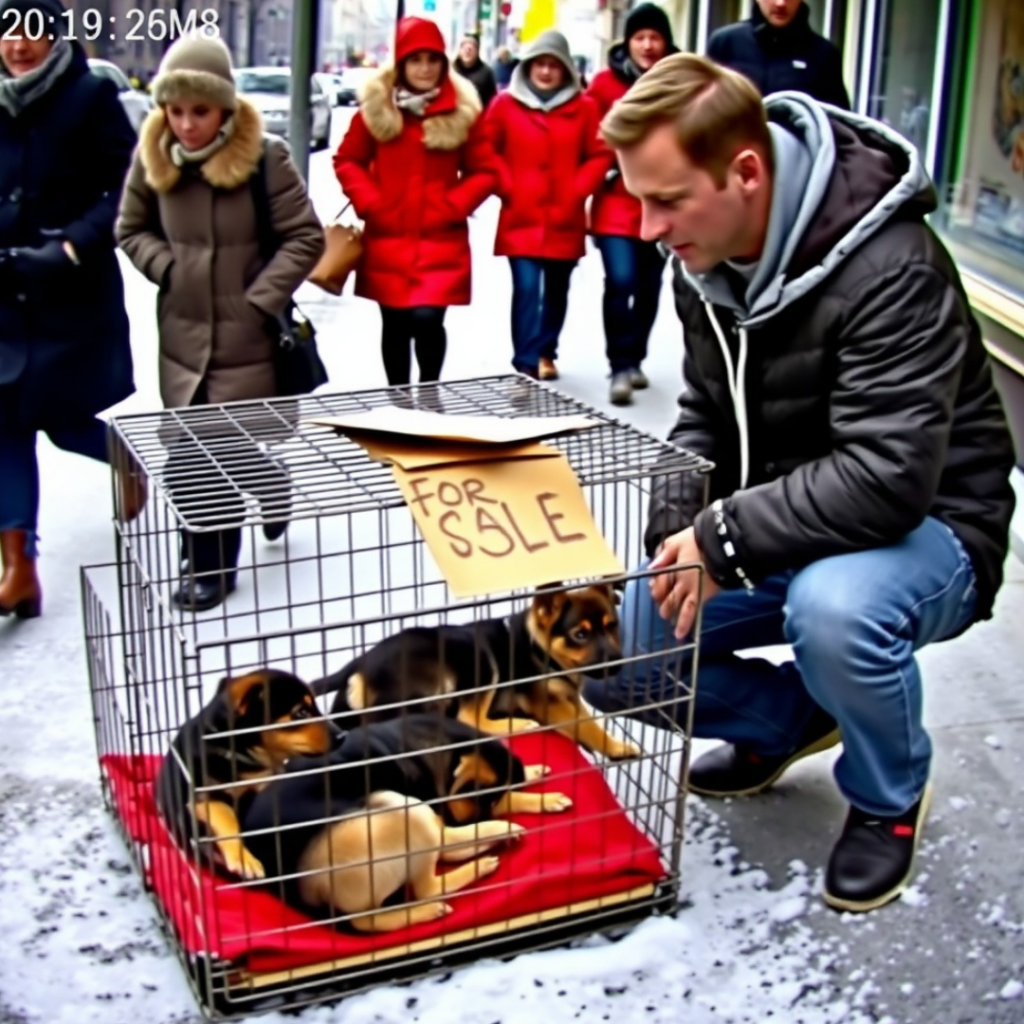 I Found a Freezing German Shepherd Locked in a Cage on Fifth Avenue — “FOR SALE,” the Sign Read, While Crowds Stepped Around Her — But When I Looked Closer at the Van That Dropped Her Off, I Realized This Wasn’t Abandonment… It Was a Business, and Someone Had to Stop It.